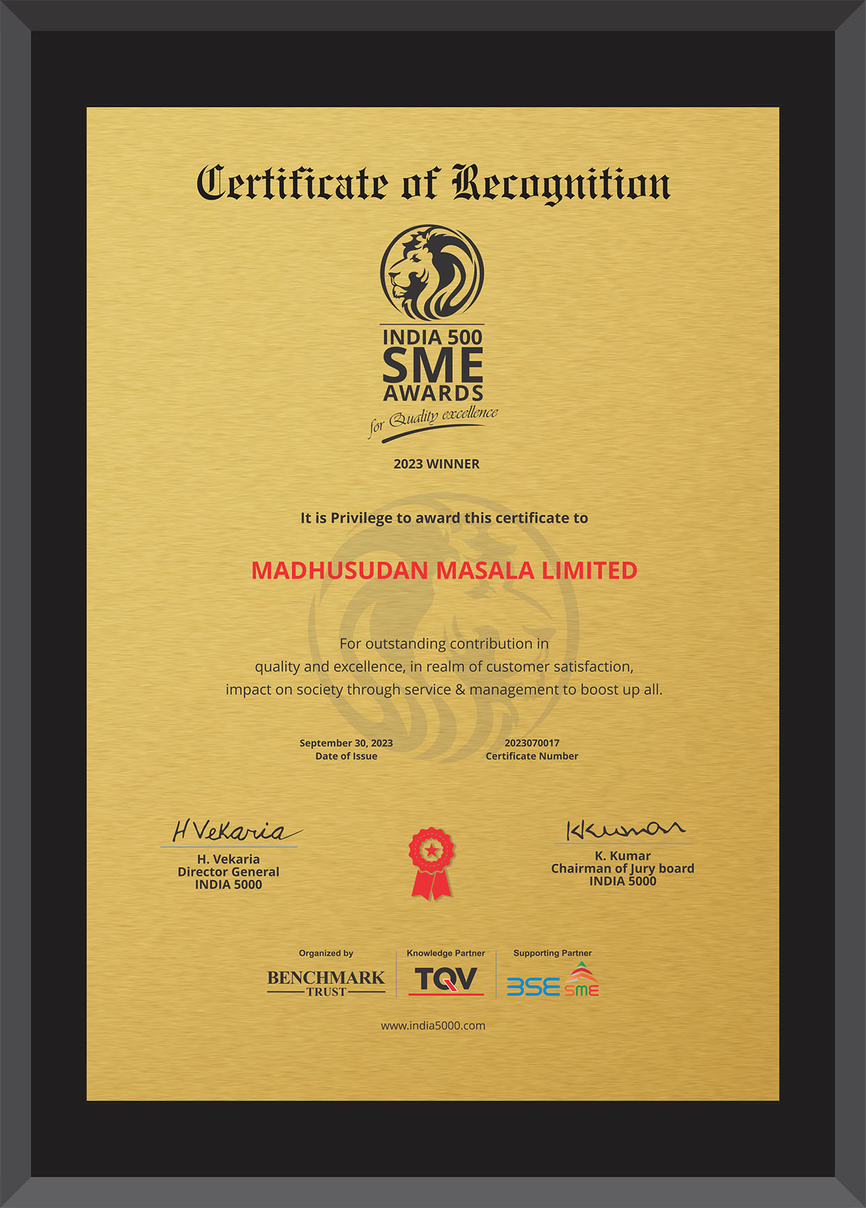 Madhusudan Masala Limited, a name synonymous with excellence and innovation, proudly stands as the winner of the prestigious India 500 SME Award 2023. The award, organized by Benchmark Trust, with TQV as the Knowledge Partner and BSE SME as the Supporting Partner, is a testament to our dedication and remarkable achievements. We are honored to be recognized for our unwavering commitment to quality, growth, and contributing to India's vibrant SME landscape. This accolade reinforces our resolve to continue delivering exceptional products and services that exceed expectations and set industry benchmarks.
